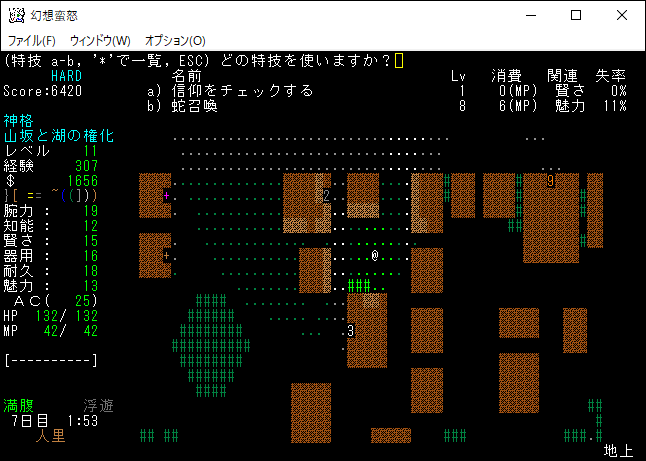八坂加奈子はレベル8になると「蛇召喚」の特技を覚えます。蛇召喚の効果はその名のとおり蛇シンボルのモンスターを味方として召喚するというものだ。今のところは戦闘で苦戦していないため使用する機会は無いかな。Dungeon Crawlのクソ弱い「棒切れの蛇」を思い出すぜ。