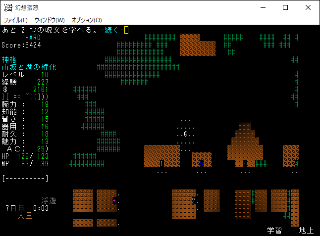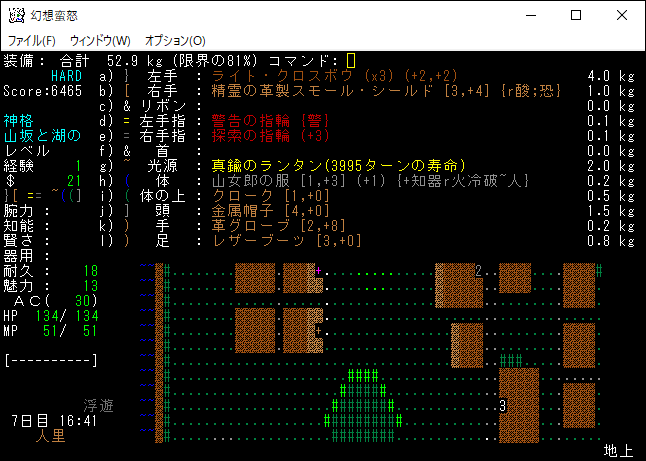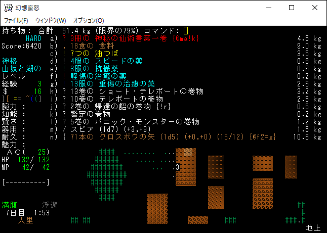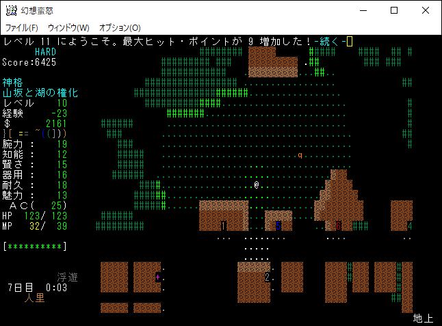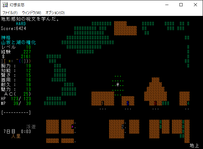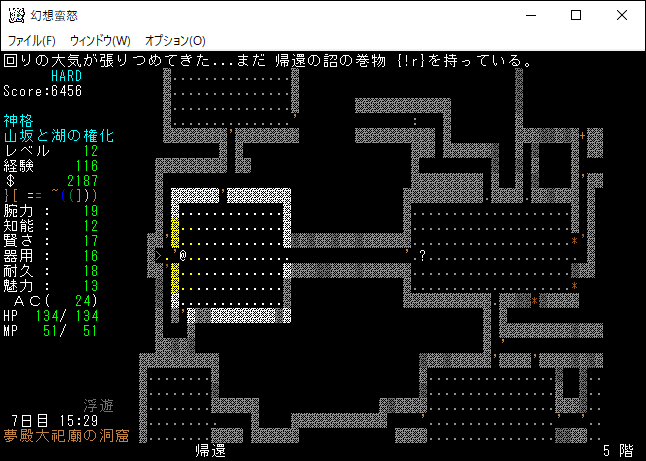 地下4階と5階を往復しながら探索していたらザックが一杯になった。仕方がないので人里に帰還します。地下5階のモンスターと戦って得た経験値は100くらいだな。やっぱり地下5階でレベルを15に上げるのは無理だろうね。