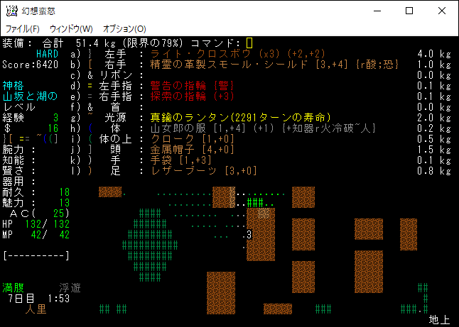 現在の装備品は上の画像。またお店で麻痺耐性の防具を買えなかった。もう開き直って地下8階くらいまで降りてレベルを15にしてしまおうか。他にどんな方法で打開できるというのだ。