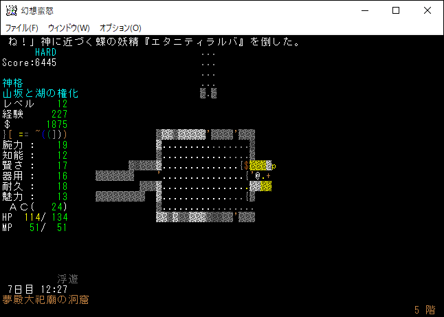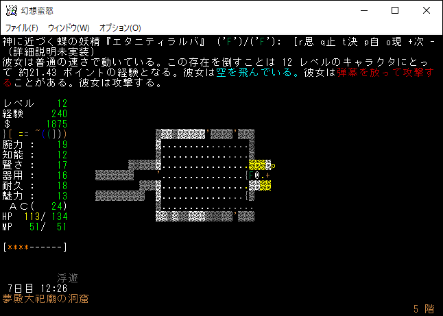 やたらとタフな妖精がいるとおもったら、ユニークモンスターだったあ。神に近づく蝶の妖精『エタニティラルバ』が出現しました。地下5階で幻想郷のユニークが出てしまうのか。そんなに強くはないため、このままクロスボウを撃ちまくろう。