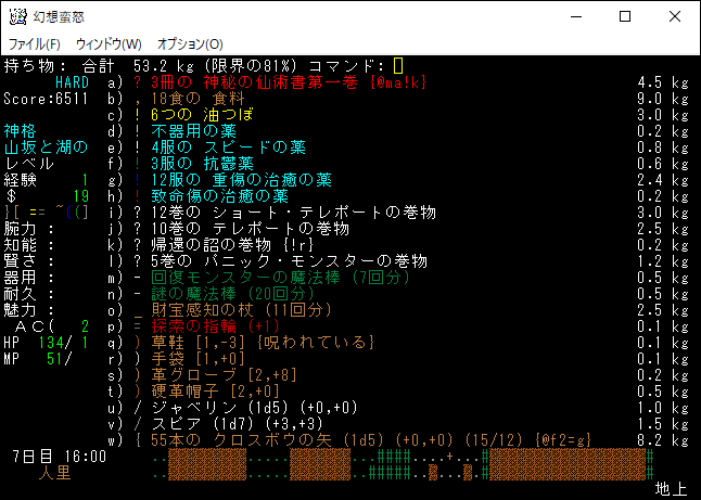 現在の所持品は上の画像。そろそろ魔道具を買い揃えたいところだ。今回の投稿は夢殿大祀廟の地下4階~5階を延々と探索します。wikiに地下5階以降はまれに麻痺攻撃をしてくる敵が出現すると書いてあったからです。