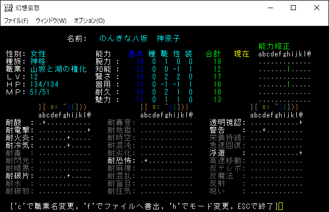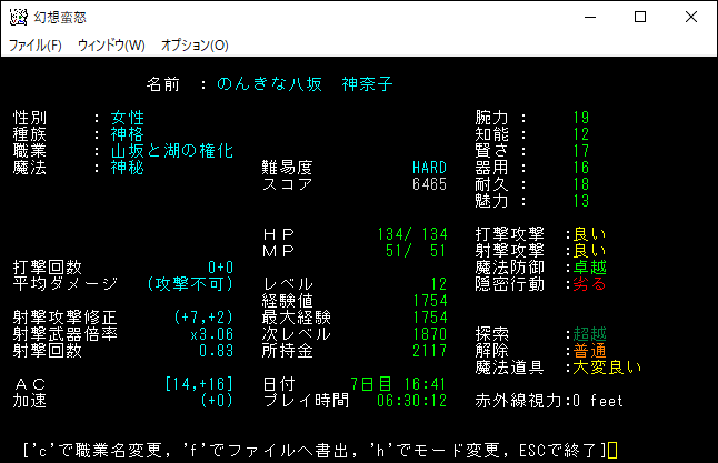 今回の投稿はここで終わりにします。現在の能力値は上の画像。レベル15にするには、あと1000ほど経験値を稼ぐ必要がある。地下8階に降りたとしても麻痺で即死する危険な戦いを長時間続けることになります。
