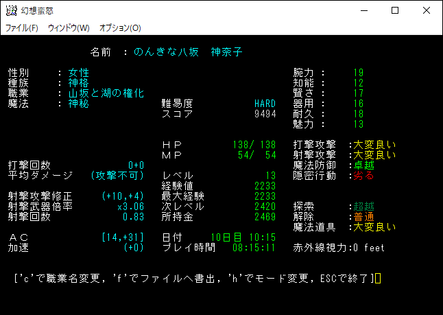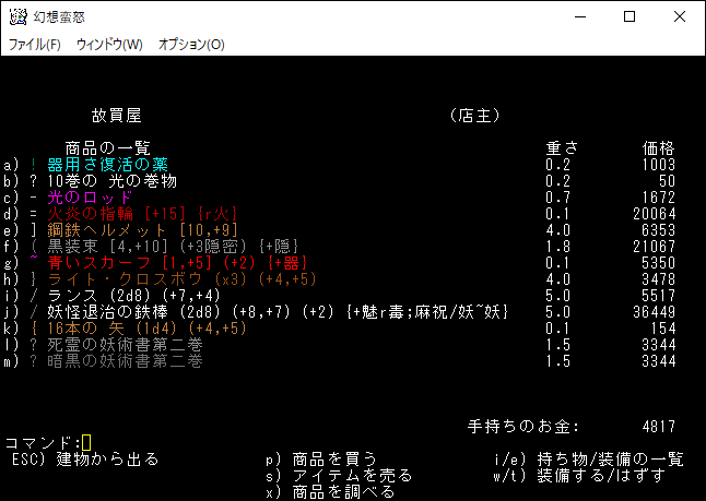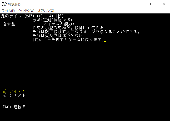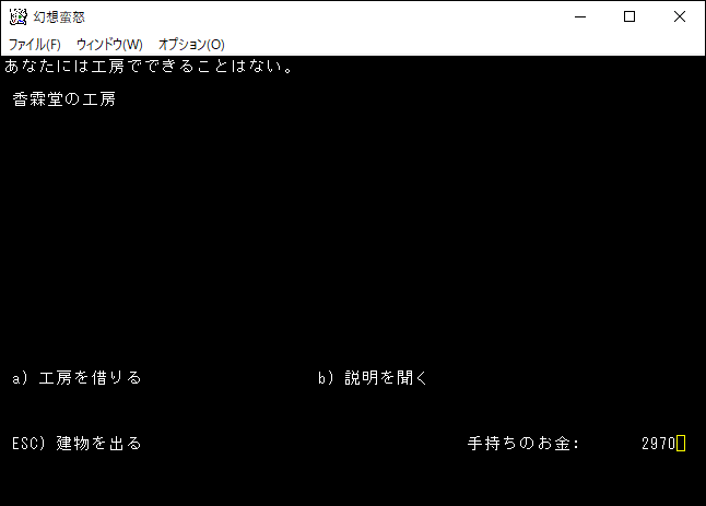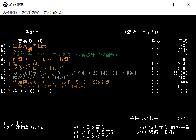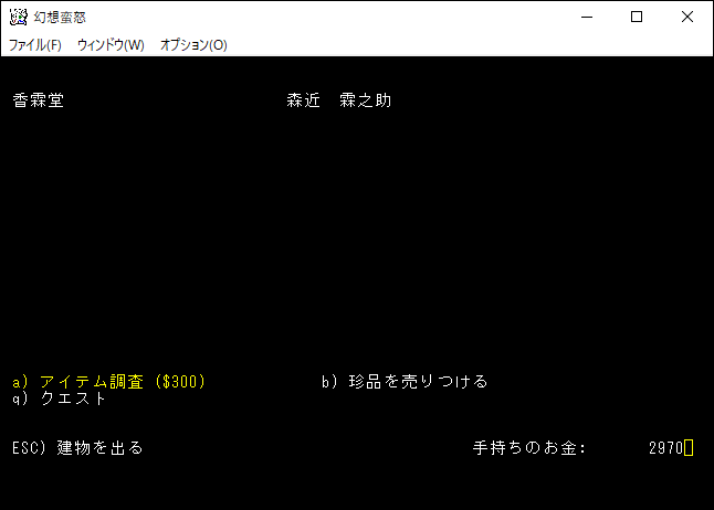 幻想蛮怒のプレイ日記を始めます。難易度HARDの八坂加奈子をプレイ中です。前回は金かわスカムを初体験しました。今回は戦利品を*鑑定*するために香霖堂に行きます。*鑑定*の巻物は高額すぎて買っていられないよ。