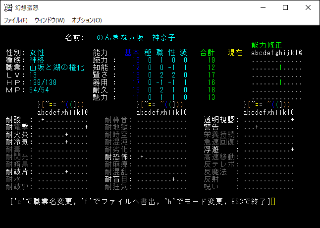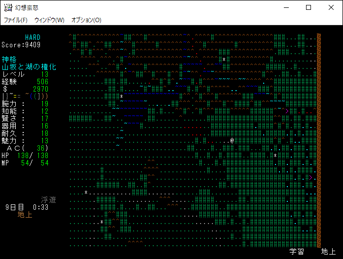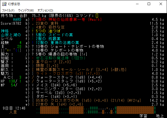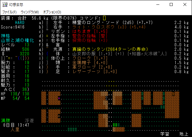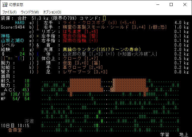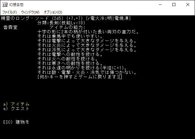 現在の装備品は上の画像。金かわスカムで精霊エゴのロングソードを入手しました。もしかしたら麻痺耐性がついているかもしれない。このロングソードを*鑑定*したいから俺は香霖堂を目指すのだ。