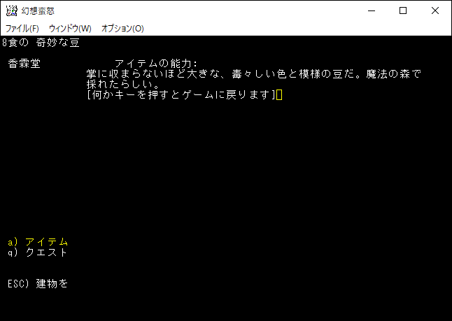 ついでに魔理沙がよくドロップする奇妙な豆を*鑑定*してもらいました。上の画像を見ても、どんなアイテムなのかわかりませんね。もう拾うのはやめようかな。しかし、上質の装備品よりもレアなアイテムな気がするため集めることにする。