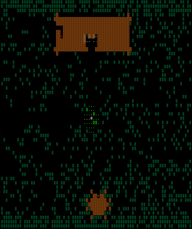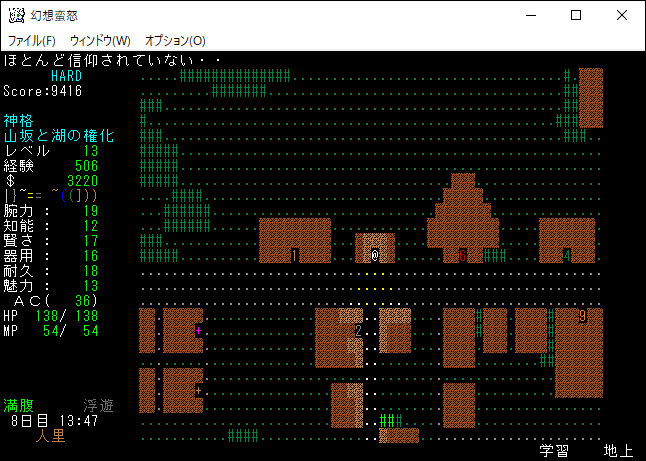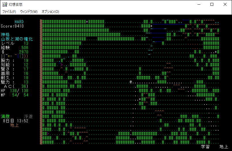 以上で旅立ちの準備は終わり。それでは広域マップに切り替えて香霖堂を目指しましょう。画面の中心にある@が人里にいる加奈子だ。画面の上側にある湖に囲まれた*は紅魔館です。目的地の香霖堂は画面の右端にある森に囲まれた*になる。かなりの長旅になるため、途中でモンスターに敗北するかもしれません。