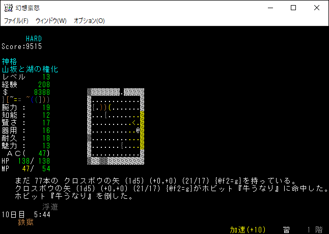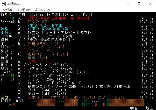 現在の装備品は上の画像。ついに盲目耐性の装備品をゲットすることができたか。これで盲目攻撃をくらいまくって巻物を読めずに敗北することはなくなった。