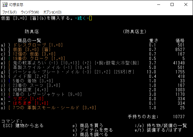 ここで防具屋さんを覗いたところ盲目耐性つきの仮面が売っていました。エゴが無いのに耐性つきなのかあ。なぜこの仮面に盲目耐性がついているのかわからないけど買います。