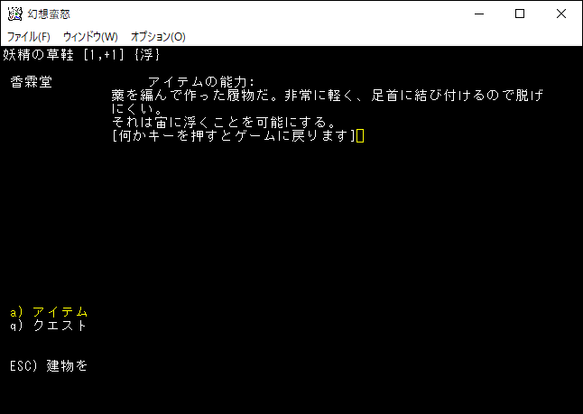 妖精の草鞋には耐性が無く浮遊しかついていなかった。ちくしょう悔しすぎる。まあしかし、たまに魔理沙が高級品をドロップするとわかったので頑張ろう。