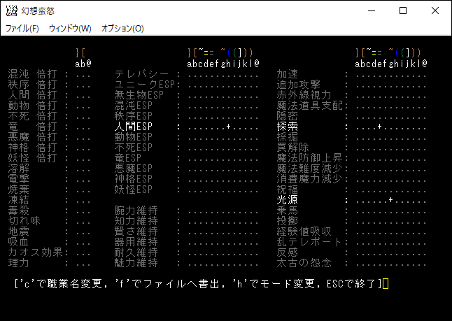 現在のスレイとESPは上の画像。『スメアゴル』から人間ESPを獲得できて本当に良かった。次回も金かわスカムをやります(笑)。スカムばかりやって馬鹿みたいだけど、金かわのおかげで確実にゲームが進展しているからやるしかない。それに魔理沙を倒しまくってレベルが上がるかもしれないからね。