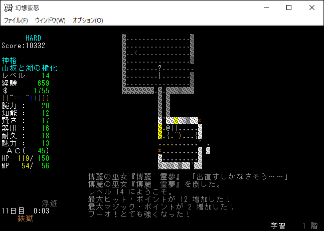 再び金かわスカムを開始します。今回はレベル上げも狙っているため魔理沙だけではなく霊夢も倒します。経験値をくれそうな雑魚敵すら倒している。霊夢を倒してレベルが14に上がりました。次のレベルアップに必要な経験値は659と多い。
