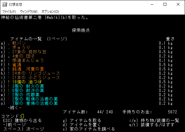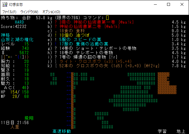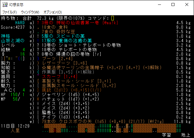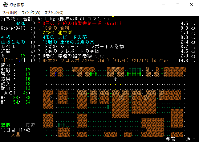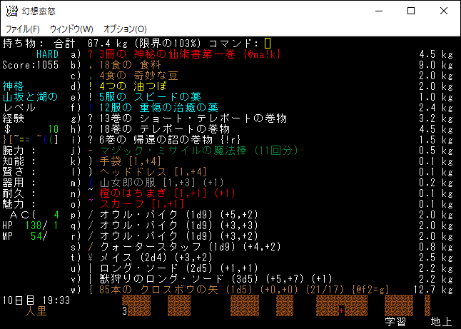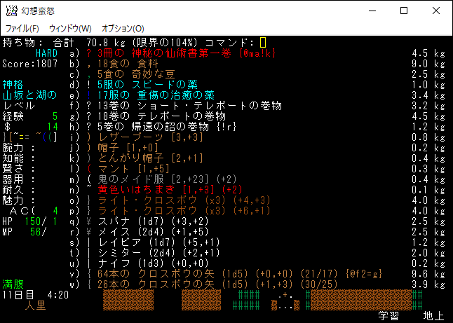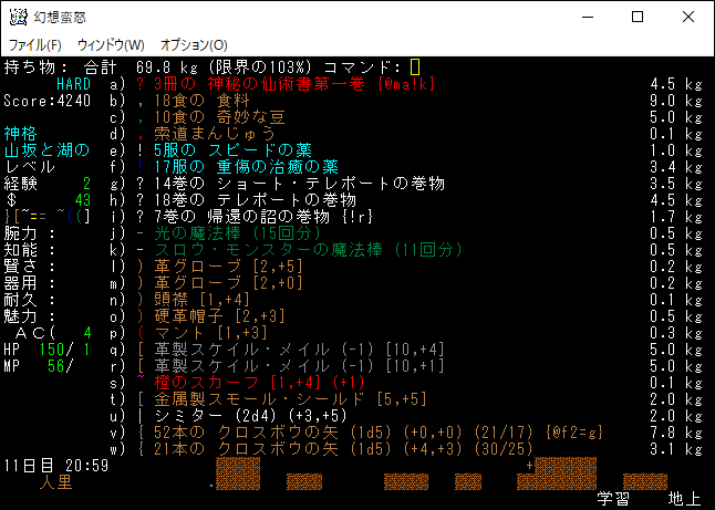 今回の投稿はここで終わりにします。現在の所持品は上の画像。次回からは夢殿大祀廟の12階くらいまで降りてユニークモンスターと戦います。抗鬱剤や聖唱歌の巻物などバフ効果のアイテムも持ち歩こう。それと神秘の2冊目に記載されている鑑定の魔法を覚えておきたい。