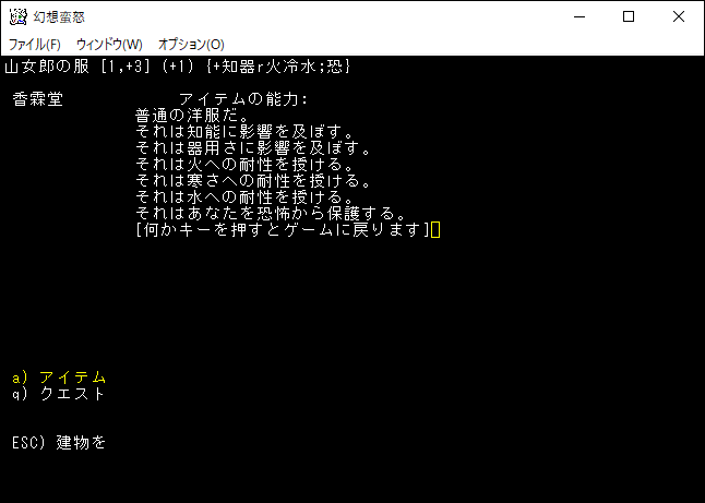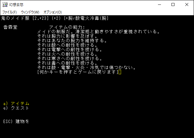 鬼のメイド服の*鑑定*結果は上の画像。元素耐性と腕力上昇のエゴだったのか。まあまあの性能だ。必要なときが来るかもしれないため売らずに取っておきます。