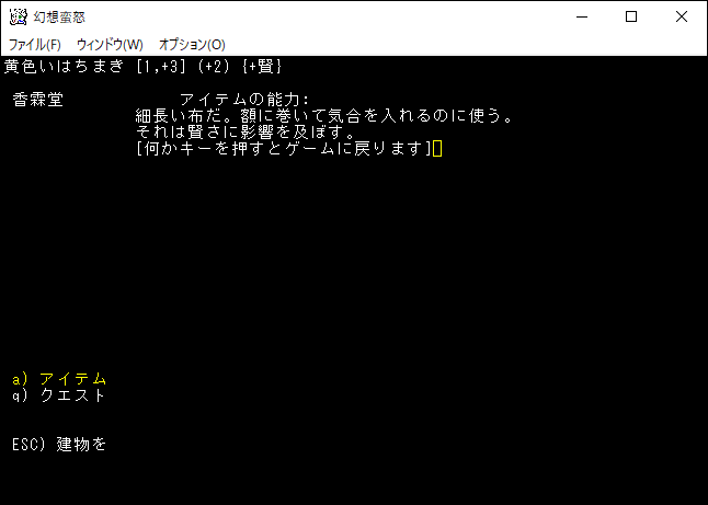 黄色いはちまきの*鑑定*結果は上の画像。賢さが上がると最大MPが上昇します。当分はこいつをリボン枠に装備しておくのがベストかな。