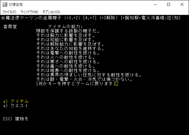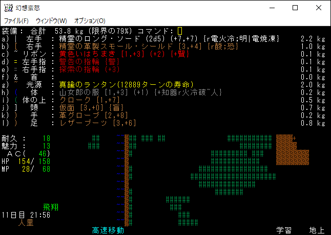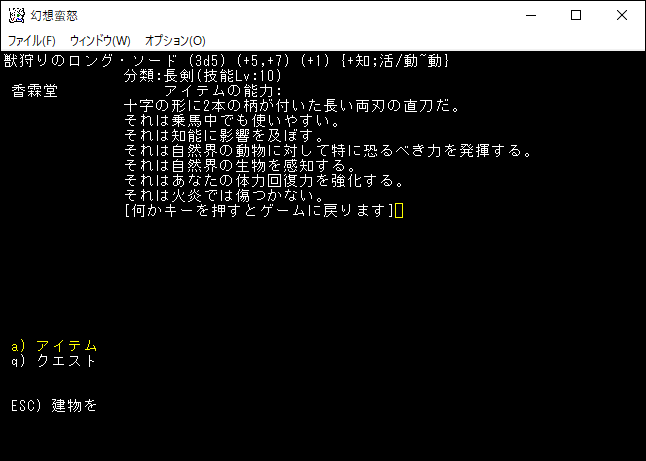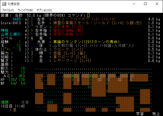 現在の装備品は上の画像。武器はクロスボウから精霊のロングソードに変えておきました。今回の投稿で念願の麻痺、盲目耐性を得ることができた。しかし、まだ混乱耐性がないため油断は禁物だな。