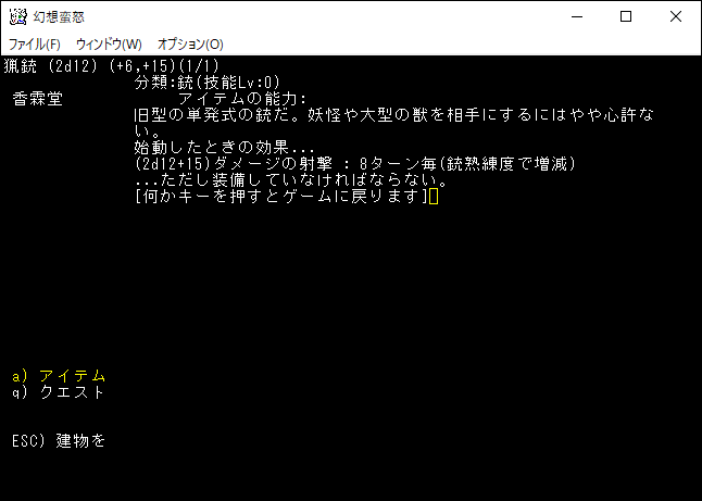 猟銃の*鑑定*結果は上の画像。銃は発動で攻撃する武器なのか。銃は絶対に使わないので売り物です。銃が出ないオプションをオンにしちゃおうかなあ。