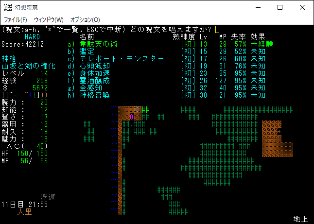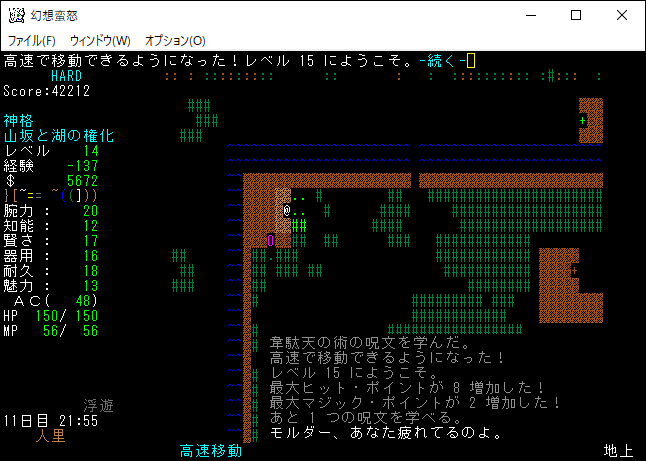 次は覚えたばかりの韋駄天の術を唱えます。未経験の魔法なので唱えた際に経験値を稼ぐことができる。これで経験値を300ほど稼げればレベルが15になるのだ。今日の俺は長時間ゲームをプレイして頑張った。魔理沙も頑張ってアイテムを落としてくれた!頼むからレベルアップしてくれ!