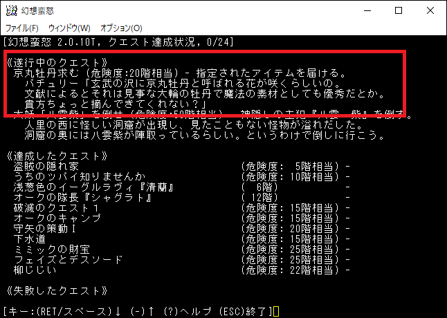 幻想蛮怒のプレイ日記を始めます。難易度HARDの八坂加奈子をプレイ中です。前回は「柳じじい」クエストを達成しました。今回の投稿は「京丸牡丹求む」クエストに挑戦します。かなり面倒くさいクエストなので早めに済ませておきたい。