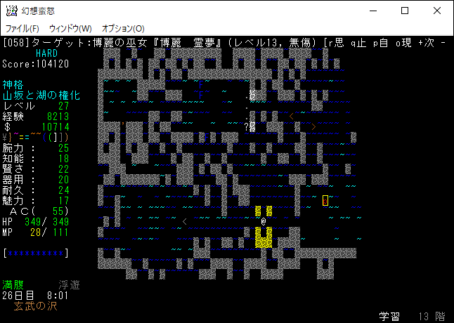 地下13階で博麗霊夢と遭遇しちゃった。無視して下り階段に向かいましょう。霊夢のドロップはショボいうえにレベルが13だから信仰ポイントを稼げないしね。