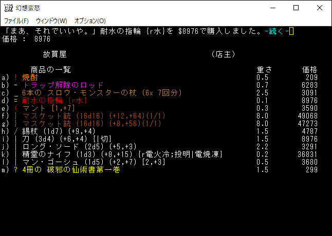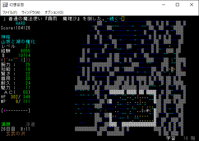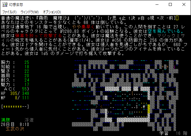 見習い盗賊かと思って弓を撃っていたら霧雨魔理沙だったあ。近くに下り階段があるからテレポートの巻物で逃げるのは嫌だ。魔理沙はドロップが美味しそうだから倒してしまおうか。
