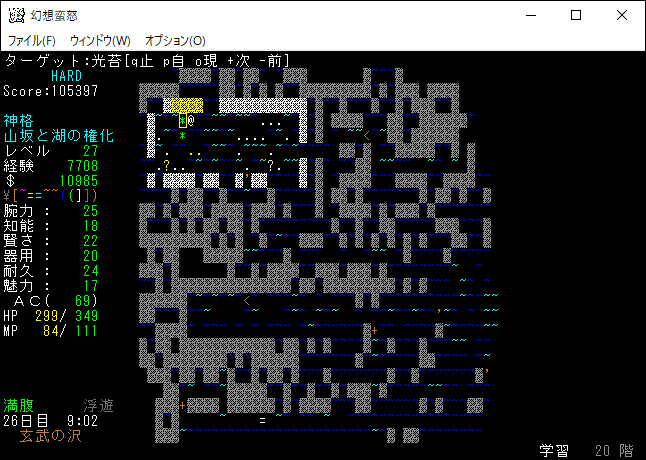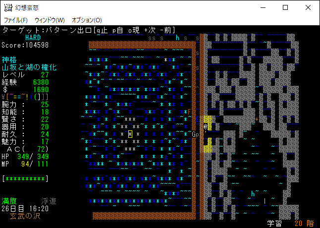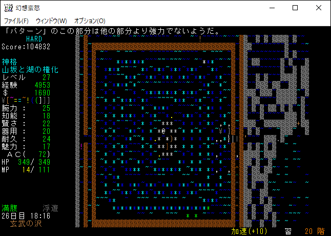 地下20階に帰還して地形感知の魔法を唱えたら永久岩を発見しました。何事かとビビっていたら「パターンvault」が生成されたらしい。俺は京丸牡丹と鰻を探したいだけなのに迷惑なことになったなあ。つーか、パターンvaultって中に入ると良いことがあるんだっけ?もう忘れてしまったよ。