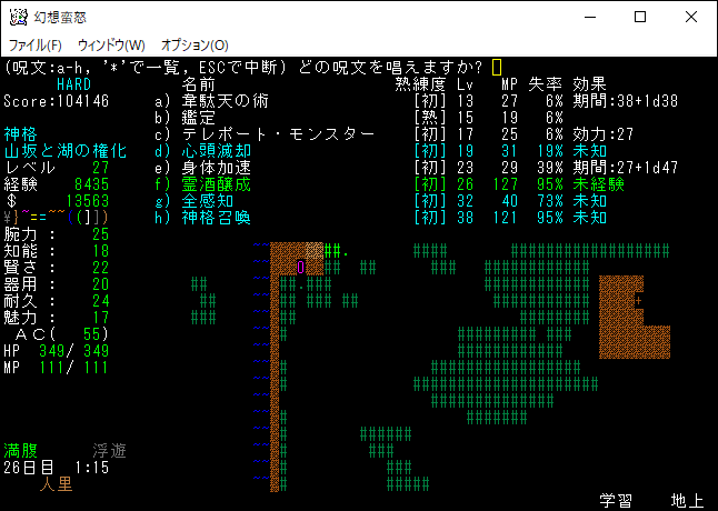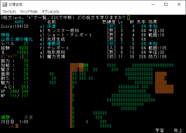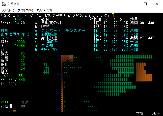 神秘の2冊目の魔法書は便利な魔法ばかりだ。とりあえずは「テレポート・モンスター」と「霊酒醸成」を習得しておきます。心頭滅却(耐火)も覚えておきたいんだけどね。3冊目の魔法書を拾ったときのために魔法の習得数を温存しておきたい。