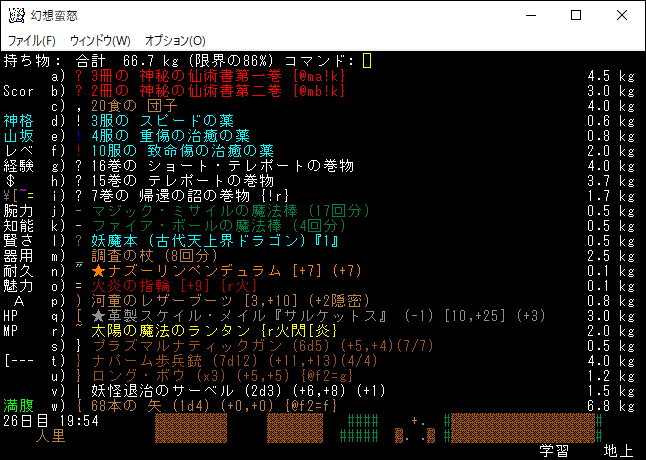 人里に帰還したときの所持品は上の画像。★ナズーリンペンデュラムはダークエルフ・ロードを倒したらドロップしました。鈴瑚がドロップしたのは★サルケットスとルナティックガンと妖怪エゴの武器だったかな。パターンの報酬は河童エゴの靴と歩兵銃であり期待外れなアイテムだった。