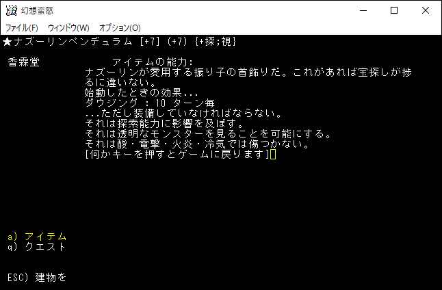 ★ナズーリンペンデュラムの*鑑定*結果は上の画像。このアミュレットを装備すると探索の値が大幅に上昇します。探索が上がれば京丸牡丹が生成されやすくなる。しかも発動するとアイテム感知が可能だ。まさに京丸牡丹のクエストにピッタリのアミュレットだと言える。入手したタイミングが良すぎてチートを使ったと思われそうだから気まずい。