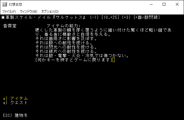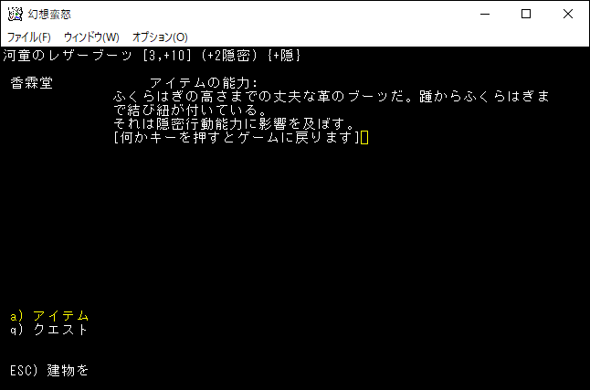 パターンの報酬である河童エゴの*鑑定*結果は上の画像。河童エゴの靴は先ほどブラマで購入しました。追加耐性がないので売却してしまおう。まったくパターンなんて歩かなければ良かった。