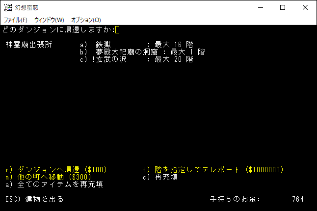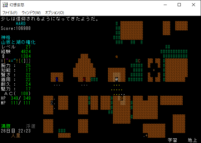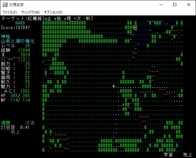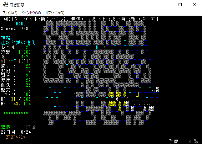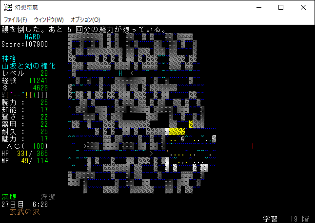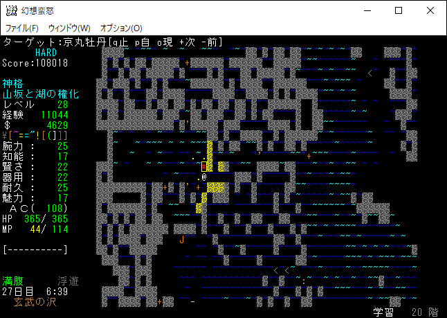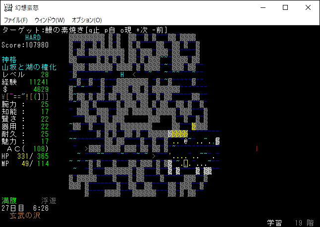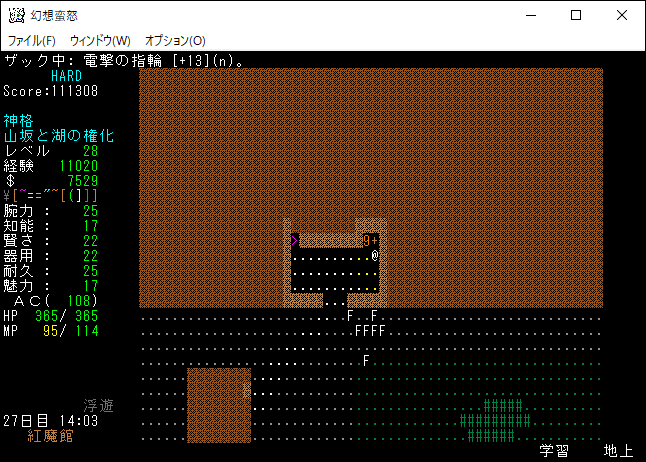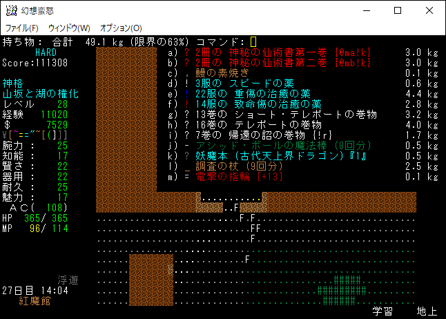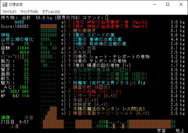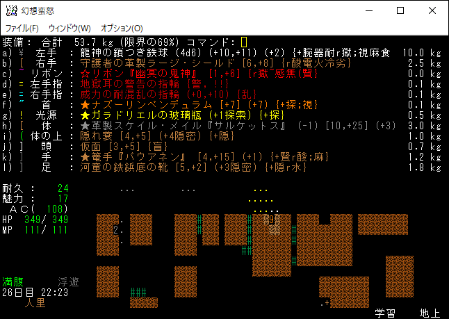 現在の所持品は上の画像。もう射撃武器を持ち歩くのはやめました。変愚蛮怒は装備のスロットに弓枠があったので嫌でも射撃武器を身に付ける必要があった。ゆえに自分は射撃前提のプレイに慣れきっていたのです。しかし、幻想蛮怒には弓枠が無いため、苦手な射撃にこだわる必要はないだろう。