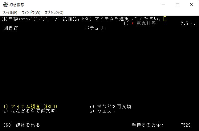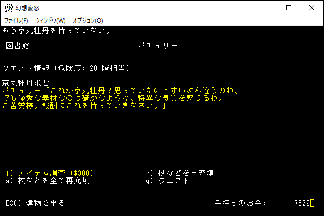 図書館で「q」を押したところ画面に「アイテムを選択してください」と表示されました。ここで京丸牡丹を選択すればクエストが達成されるわけだな。京丸牡丹のクエストは放棄できるらしいけど、やり方は知らない。