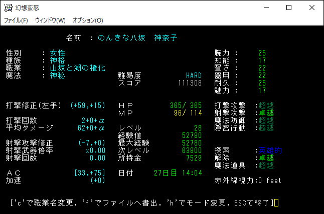 現在の能力値は上の画像。これまで多くのクエストを達成してきたけど、それほど戦力は強化されなかった。やっぱり加奈子はユニークを狩らなければ強くなれないんだよ。信仰度2だと弱すぎてスコア倍率20%のユニーククラスとは思えない。