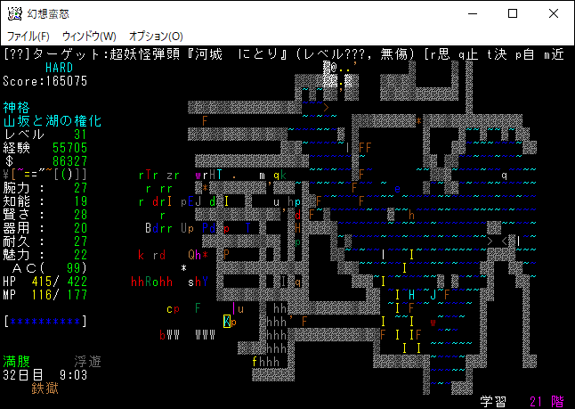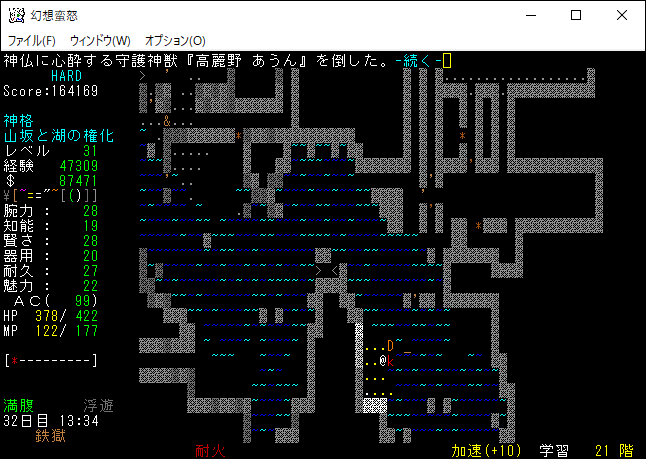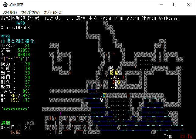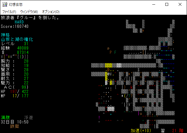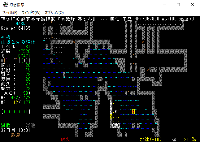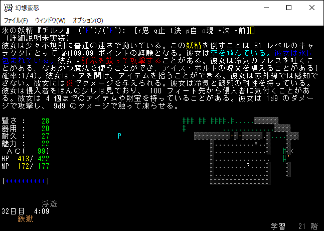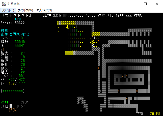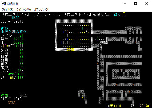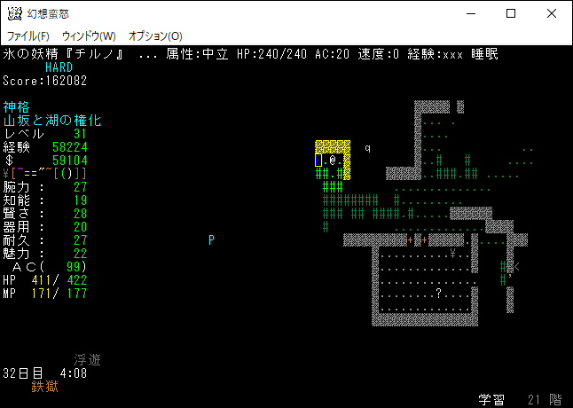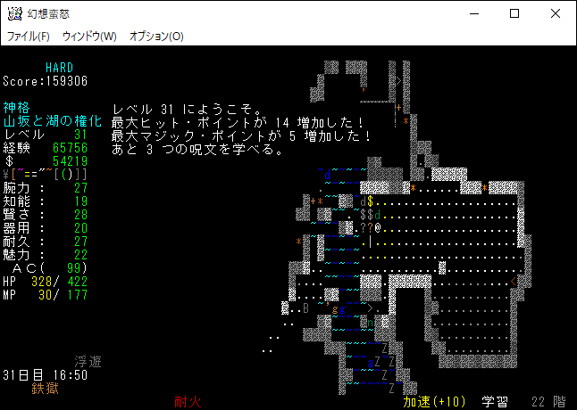 間違えて地下22階に降りてしまった。こういったミスで地下24階ランクエに突入しそうだから怖すぎる。はやく地下21階に戻ろうと移動していたらレベルが31になりました。紅魔館で「花崗岩の壁」を養殖してレベルを36に上げたい。