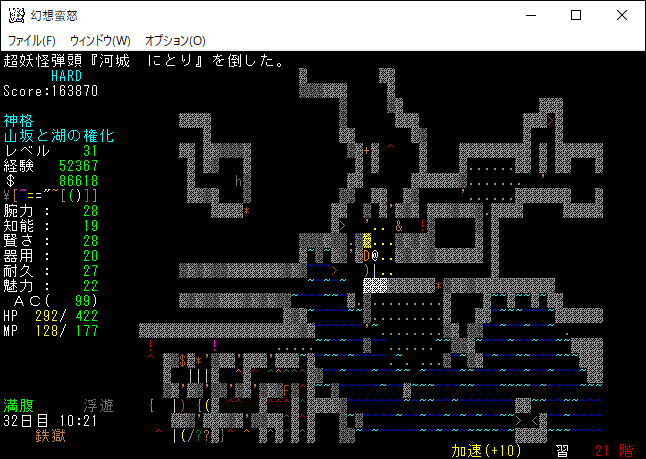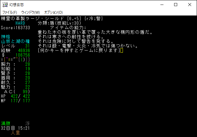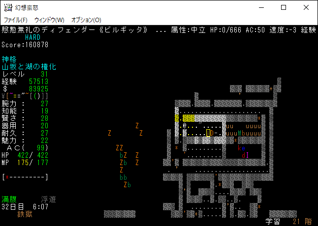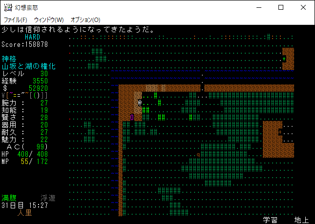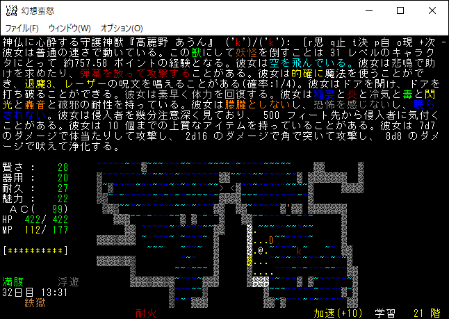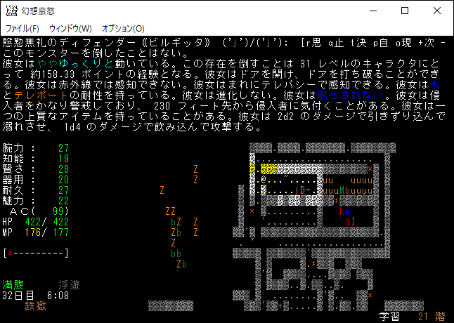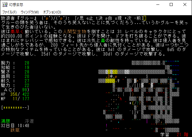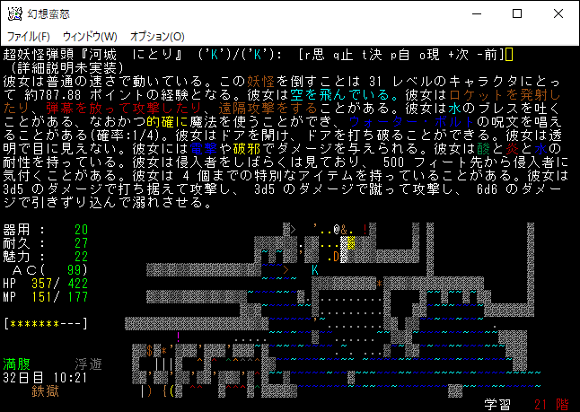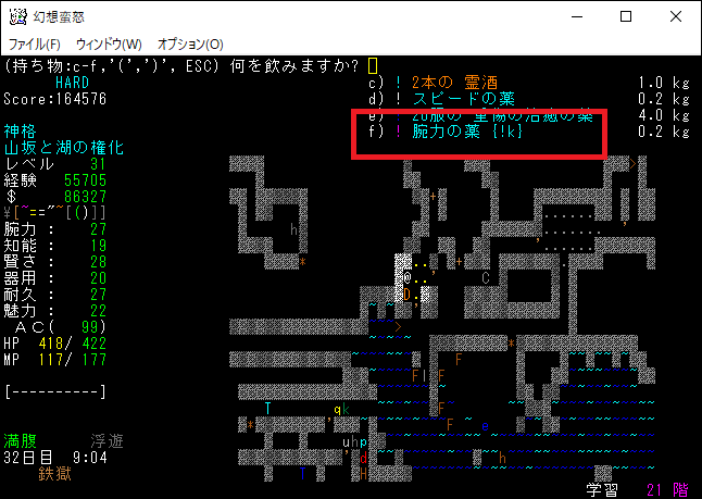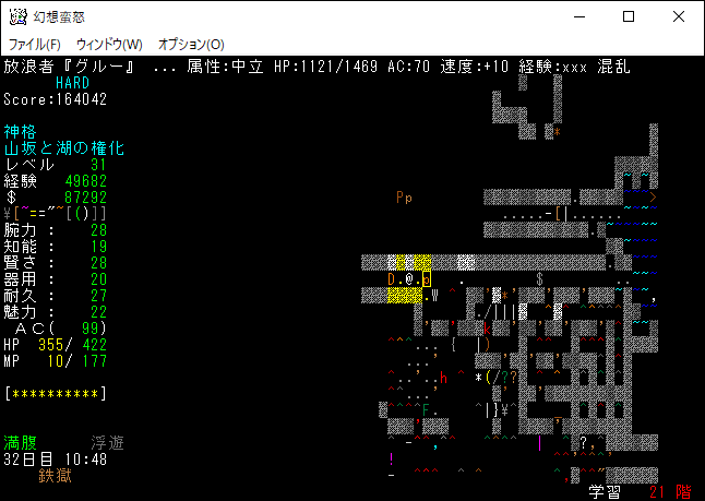 間違えて地下22階に降りてしまった。こういったミスで地下24階ランクエに突入しそうだから怖すぎる。はやく地下21階に戻ろうと移動していたらレベルが31になりました。紅魔館で「花崗岩の壁」を養殖してレベルを36に上げたい。