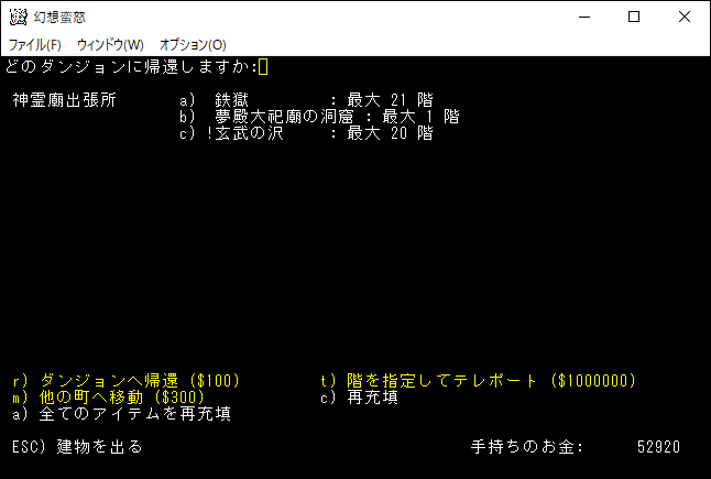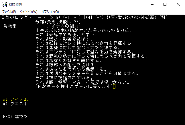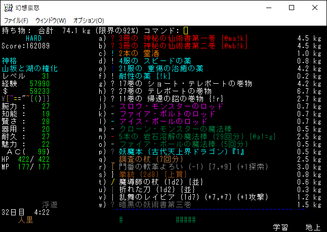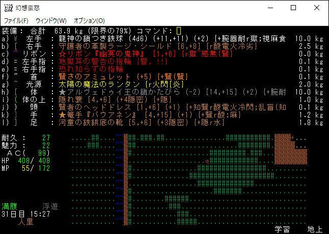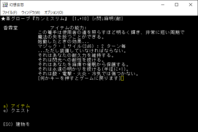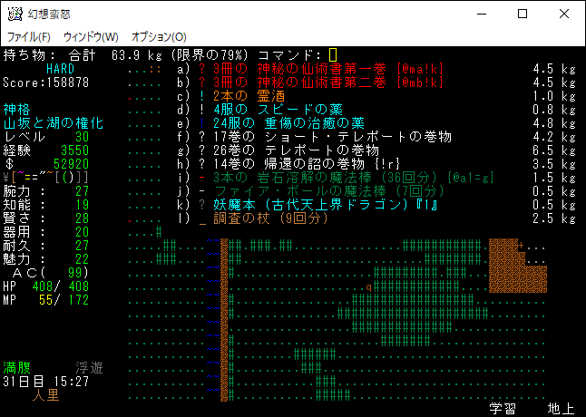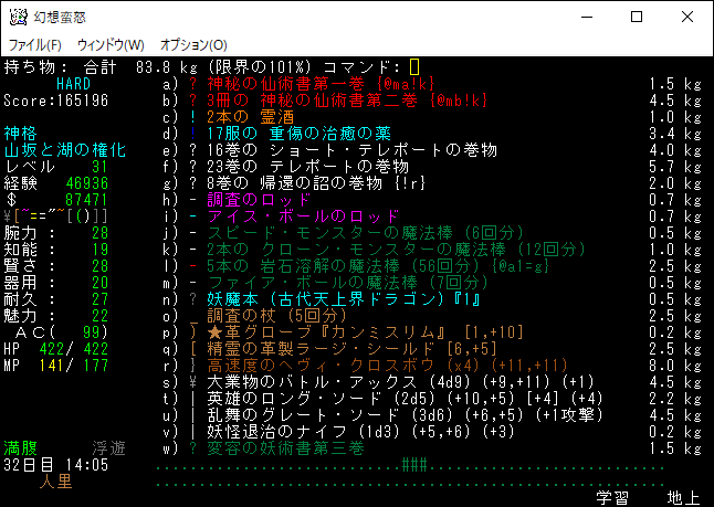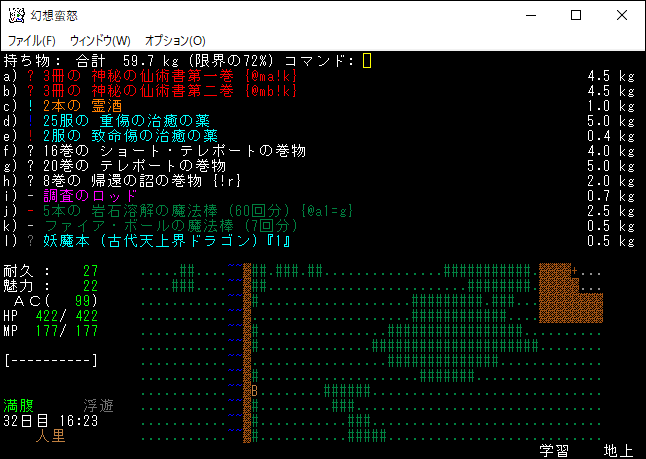 人里に戻ったときの所持品は上の画像。スピードの薬を全て破壊されてしまった。次回からは「常に非常に小さいフロアを生成する」オプションをオフにしよう。沢山の高級品を拾えたけど即戦力になりそうな武具は無さそうだ。