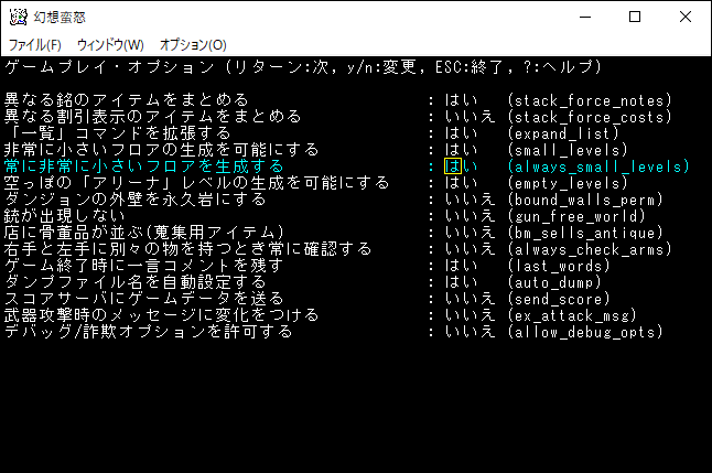 現在はオプションの「常に非常に小さいフロアを生成する」をオンにしています。小さいフロアならユニーク狩りが捗ると思ったからです。このオプションをオンにするべきではなかった。ユニークの居場所なんて全モンスター感知を使えば簡単にわかる。それにモンスターの集団からブレスをくらいまくって物資が破壊されてしまう。