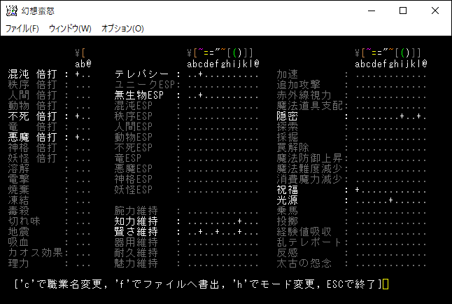 現在の耐性は上の画像。混沌耐性がないから地下24階ランクエに挑めない。暗黒耐性がないので紅魔館を探索することができない。いったい俺はこれからどうすれば良いのだ。