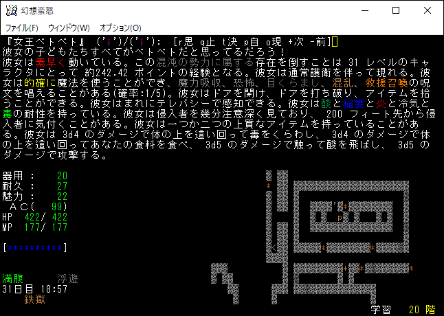 何度もフロアを移動したけどユニークモンスターが見つからない。ようやく発見したユニークが「女王ベトベト」だった。こいつは的確に救援召喚を唱えるから倒すのが難しい。強い配下と協力しなければ勝てないね。