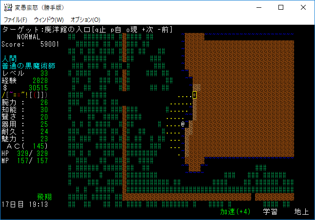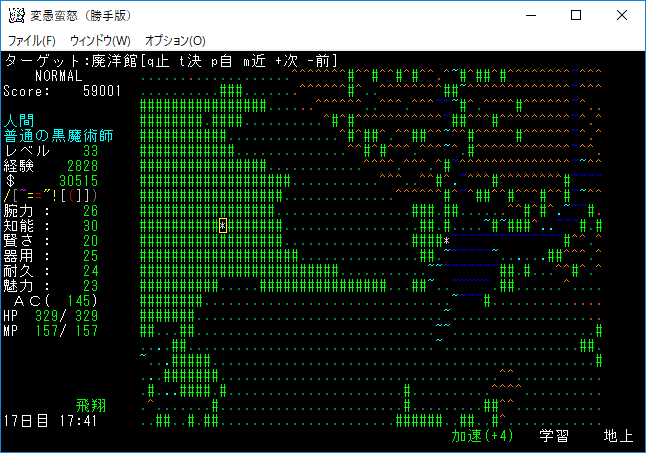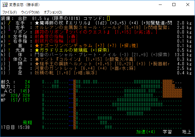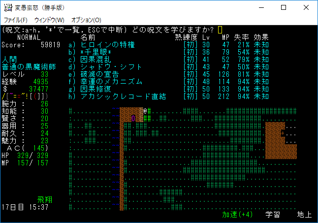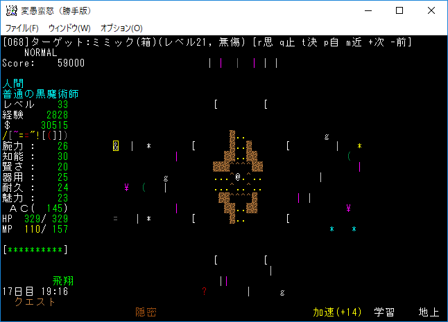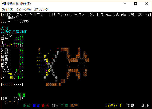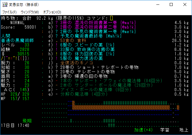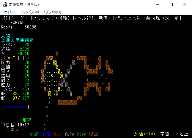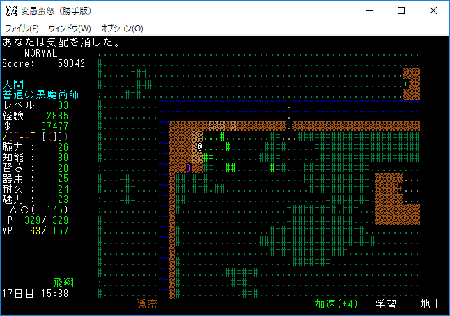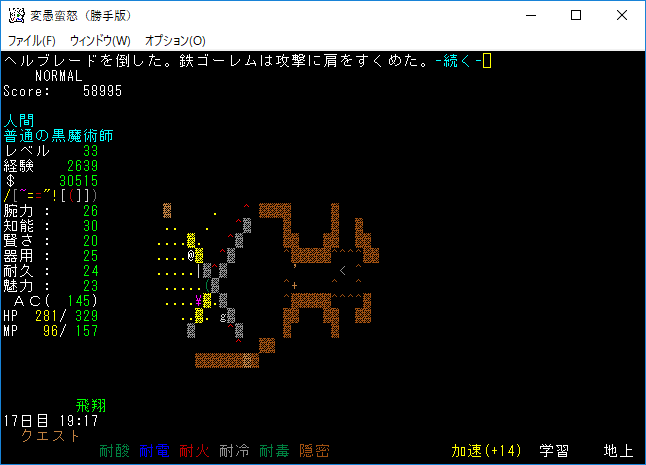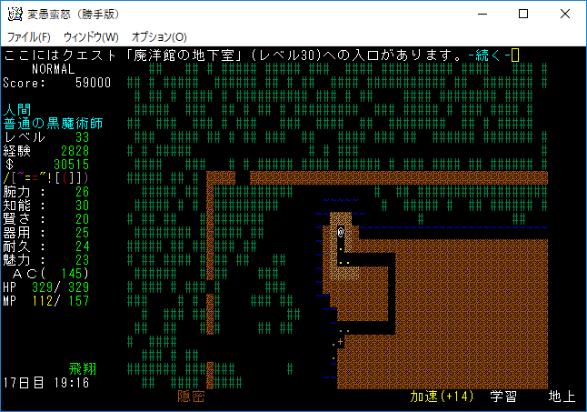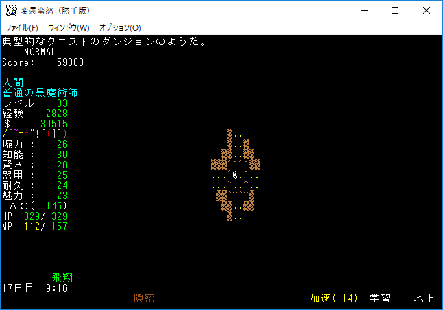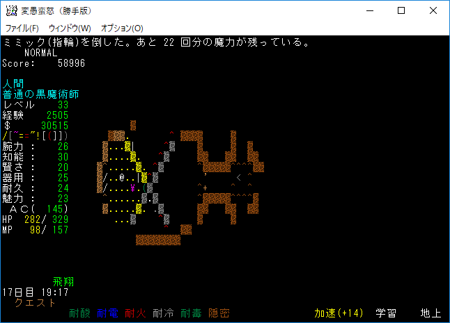 隠密と加速を上昇させた。クエストに挑もうか!30階相当の難易度かと言われればそうかなあと思う。高隠密でテレポートの巻物を読みまくっていればあっさりとクリアできるからね(本家)。