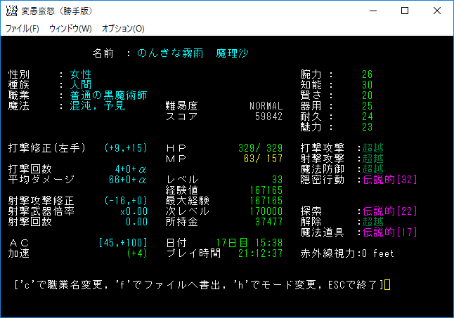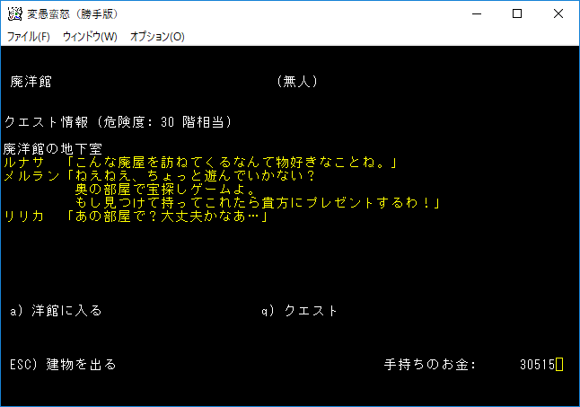 おはようございます。変愚蛮怒東方Project勝手版のプレイ日記を始めます。今回はクエスト『廃洋館の地下室』に挑戦をします。本家、変愚蛮怒の宝物庫と似ているのかな。難しいクエストだったから緊張をしています。