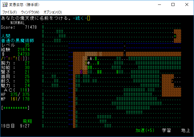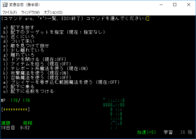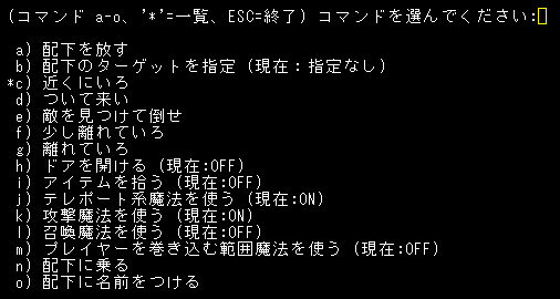 勝手版ではペットを配下と呼ぶみたい。『p』を押すと配下のコマンド画面が表示をされます。さらに『o』を押すと名前をつけられる。配下に名前をつけると妖魔本に格納しなくても視界内にいれば一緒に帰還できるようになります(たしか本家だとね)。この場合、帰還先が壁に囲まれていると配下を消失します(たぶん)。詳しいことは忘れてしまいました。上記は参考にしないでください。