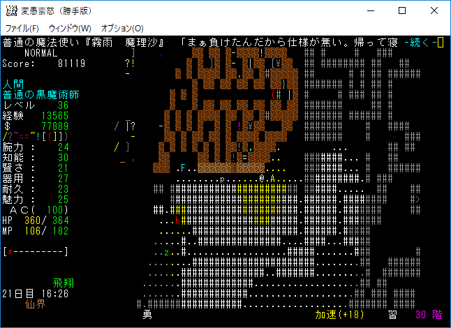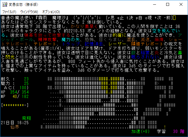 またユニークモンスター『霧雨 魔理沙』が登場をした。私も魔理沙を操作しているからモヤモヤと変な気分になってくる。地下30階の魔理沙を調査してみましょう。