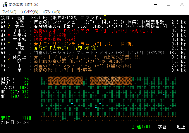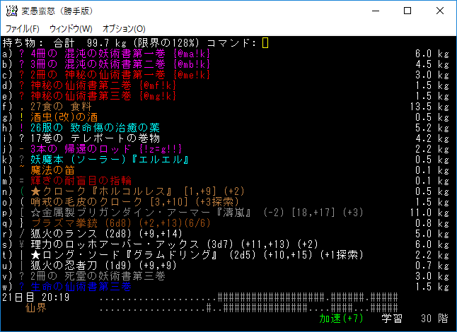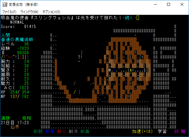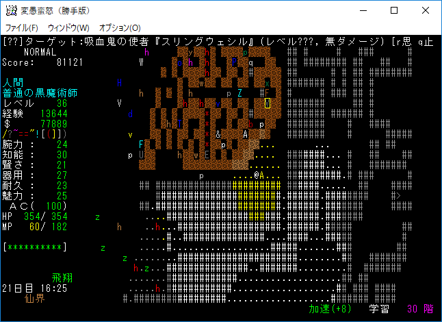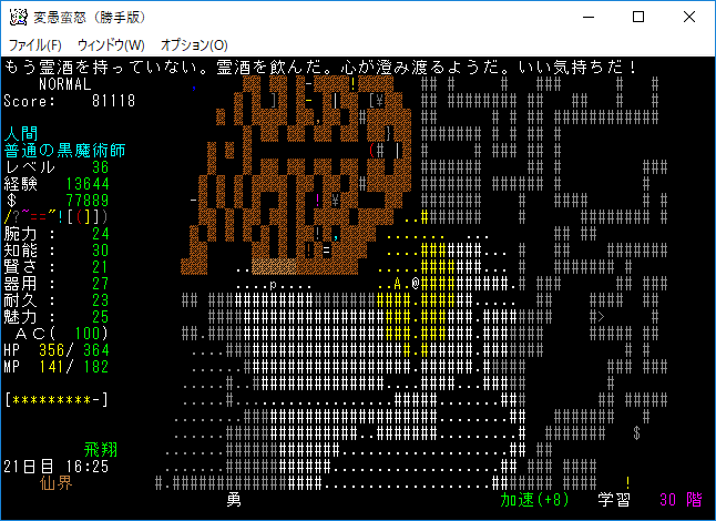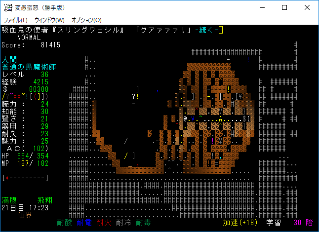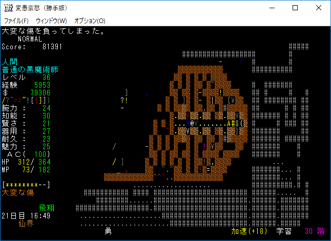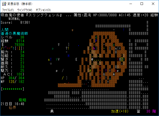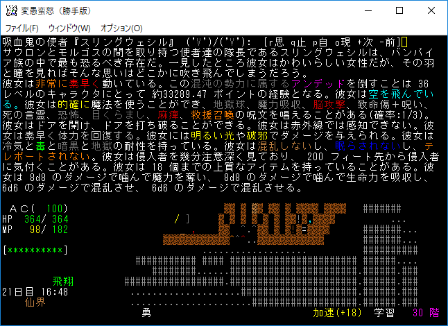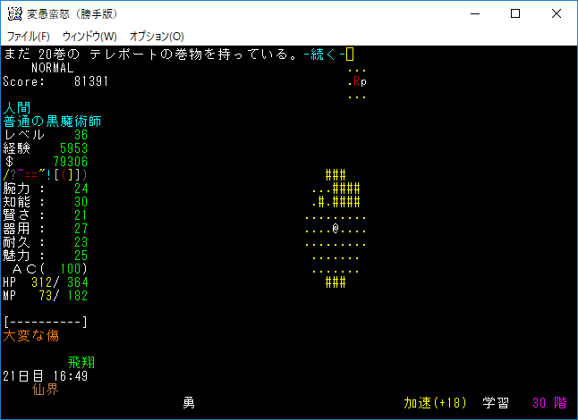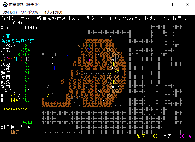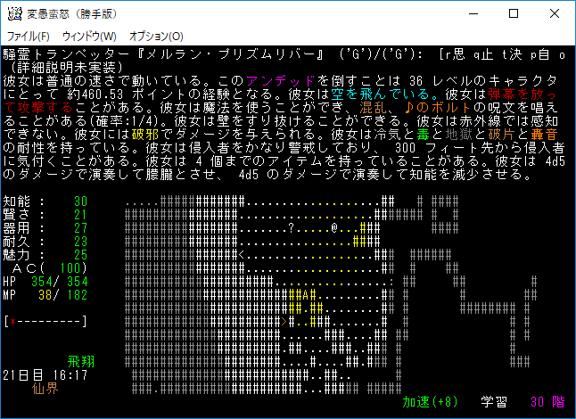 おはようございます。変愚蛮怒東方Project勝手版のプレイ日記を始めます。前回はダンジョン『仙界』に初めて侵入をしました。入口の階段を降りて早々にvaultを発見。感知の魔法で強敵がいるか調べてみましょう。