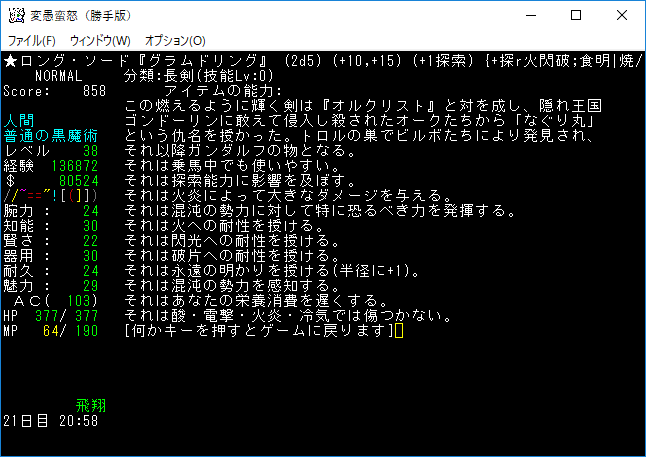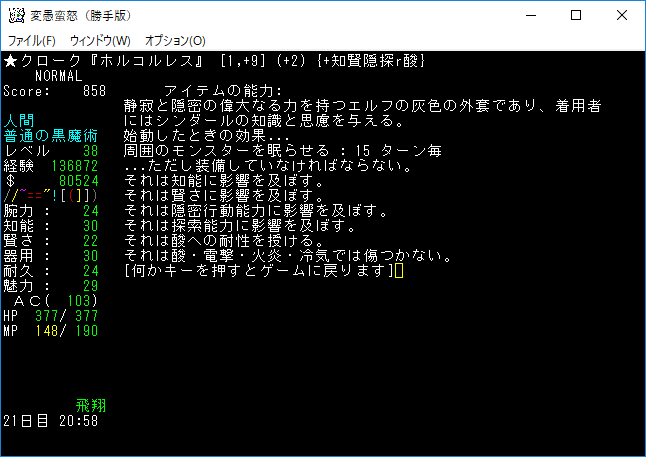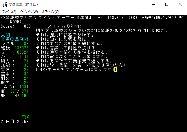珍しくランダムアーティファクトを手に入れたぞ。『濤嵐』(読めない)は鎧枠で時空、暗闇耐性がつくのか。素晴らしいね!