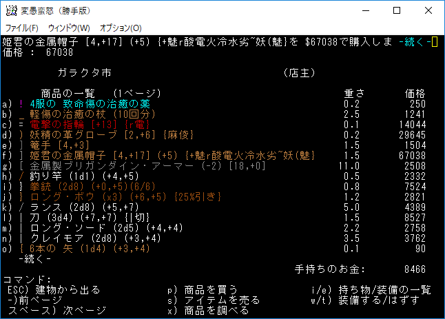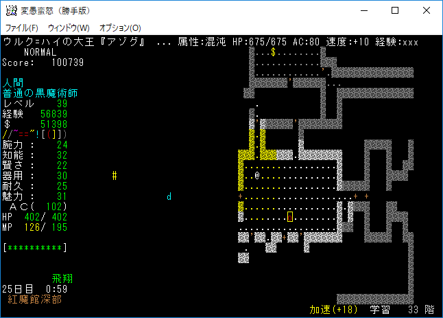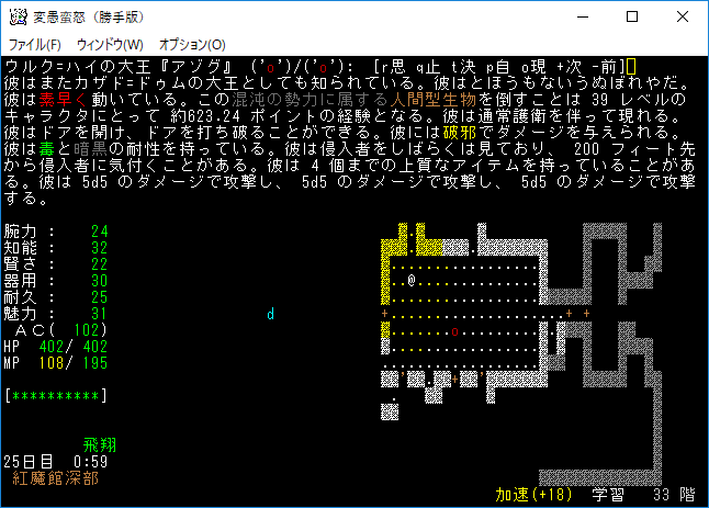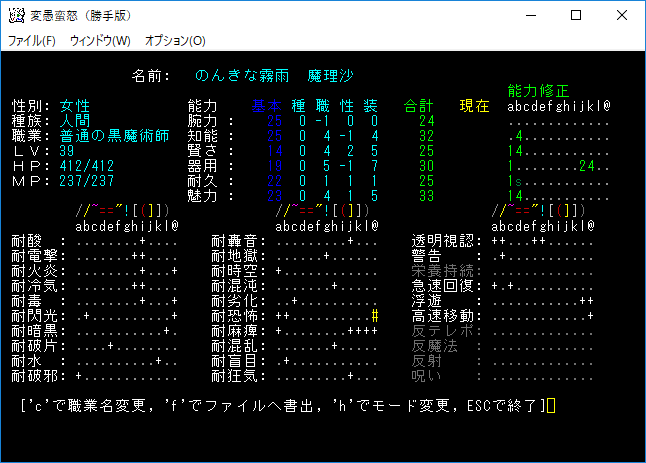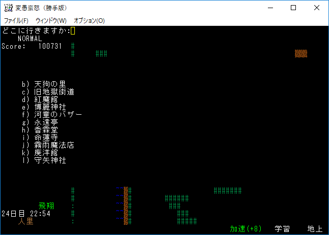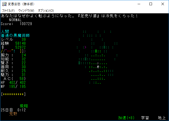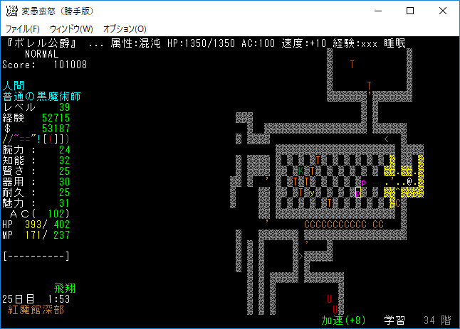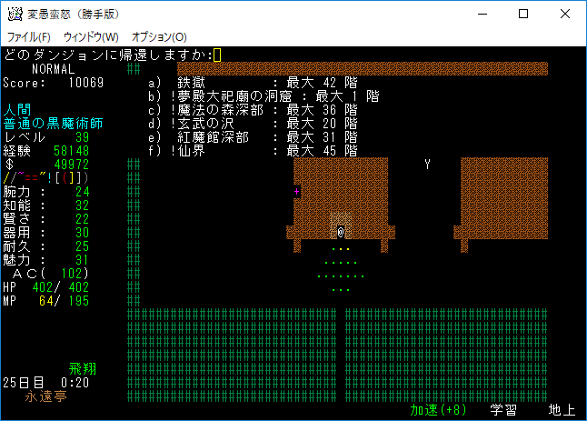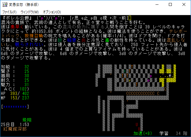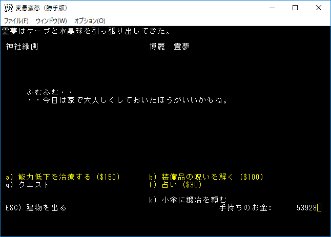 おはようございます。変愚蛮怒東方Project勝手版のプレイ日記を始めます。引き続き『紅魔館深部』を攻略していきます。その前に占いをしたり足売り婆に変異をつけてもらおう。