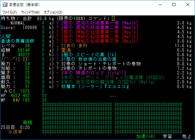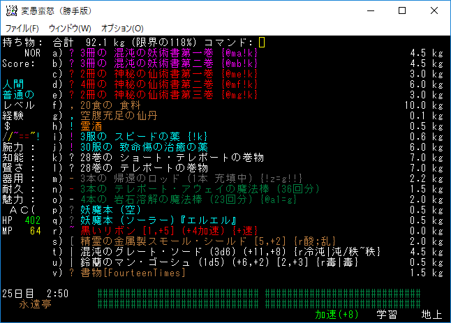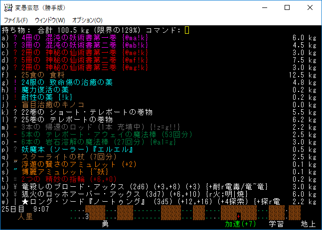 ユニーク戦もなく人里へ帰還をしました。地下36階まで潜ったけどユニークと遭遇はせず。ゴミみたいなアイテムばかりでツモが悪かったな。拾ったアーティファクトも使い所はなさそう。