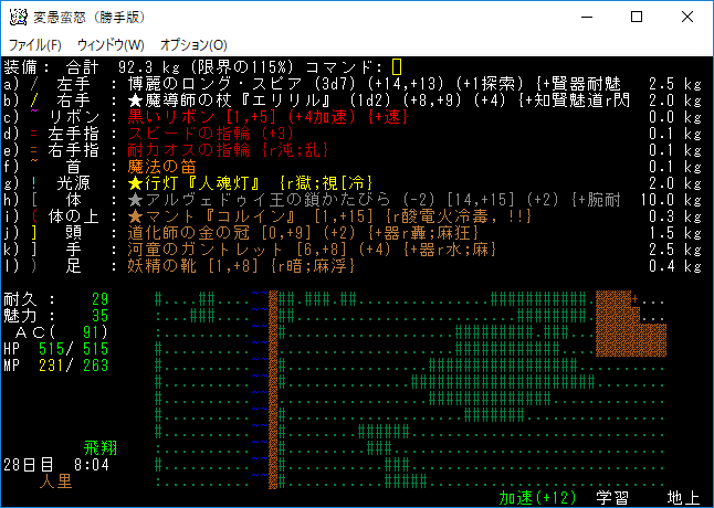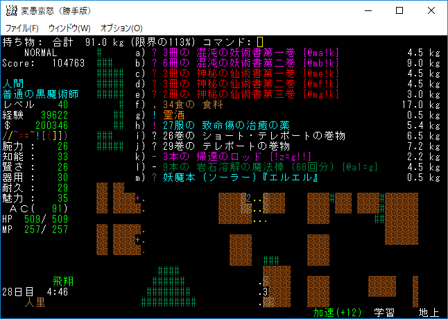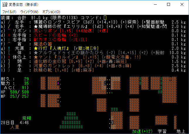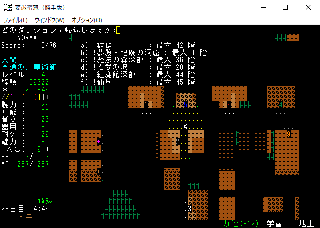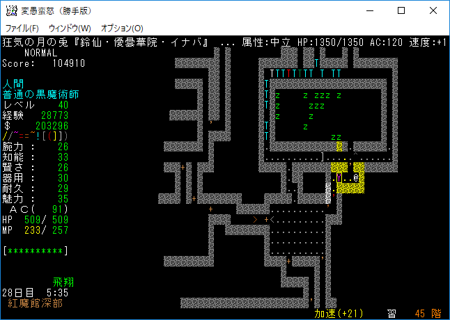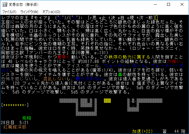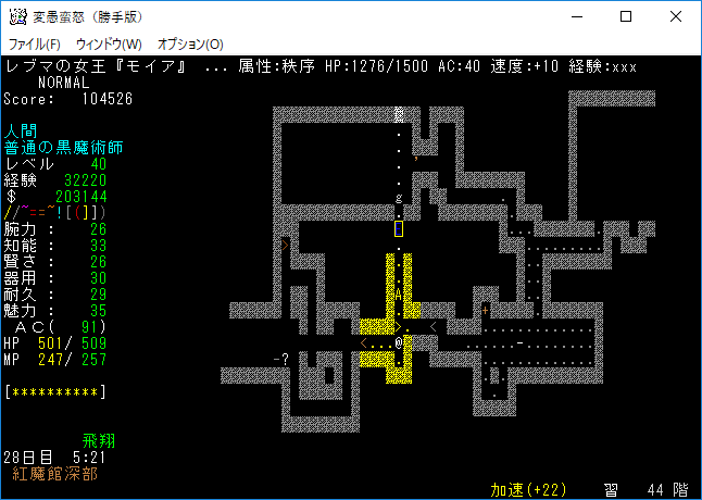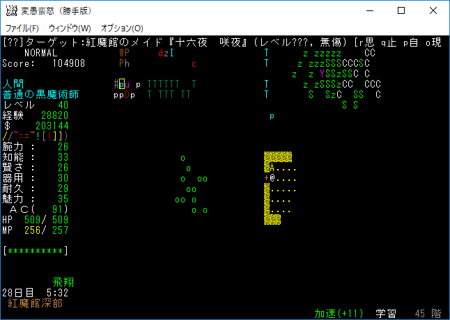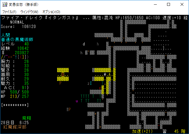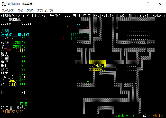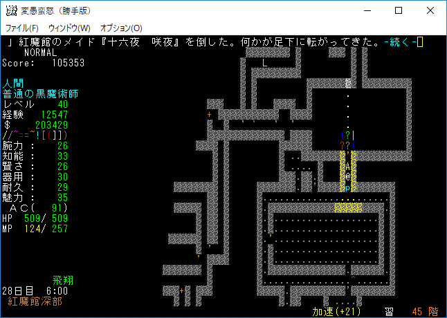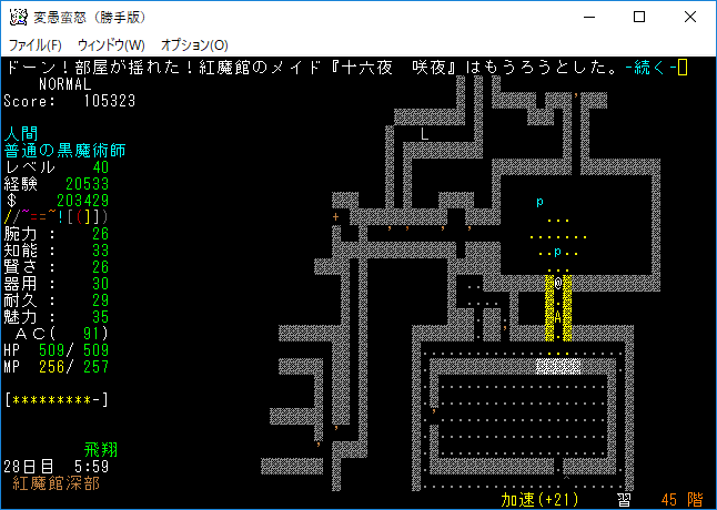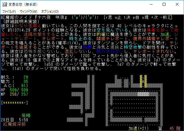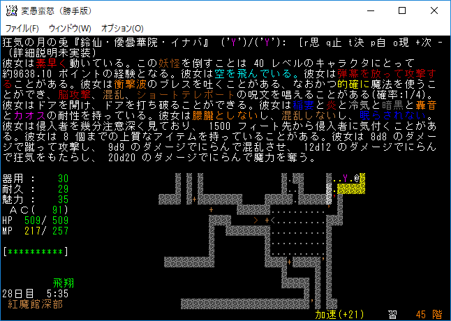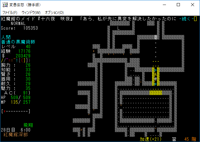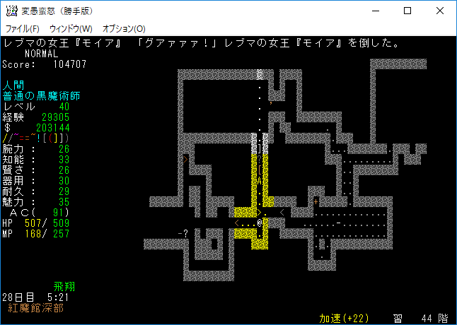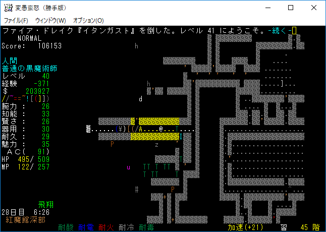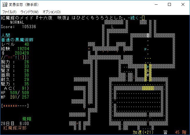 おはようございます。変愚蛮怒東方Project勝手版のプレイ日記を始めます。『紅魔館深部』を探索中。地下44階まで攻略を進めました。最深階の50階には『レミリア・スカーレット』さんがいます。敵が強くなってきたから気を抜かずにいこう!