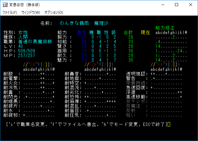 調査をしようと思ったら咲夜さんがぴょんぴょん飛び回りだした。視界内に捕らえるのを苦労したよ。能力を見てみるとテレポート系の魔法を多用するのね。時も止めてくるし(反則!)、打撃攻撃も痛い。いま逃げても神様だって許してくれるはずさ。