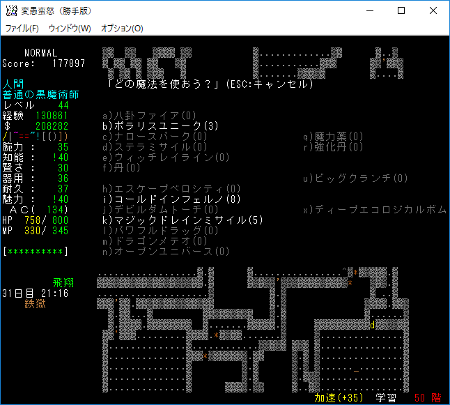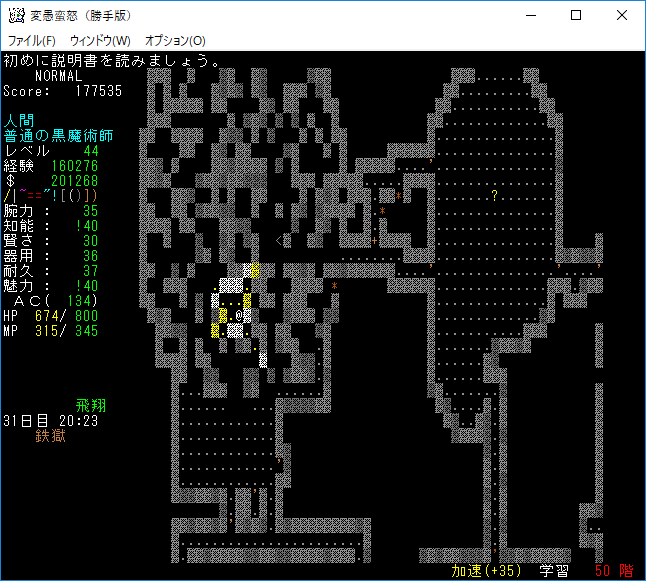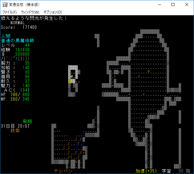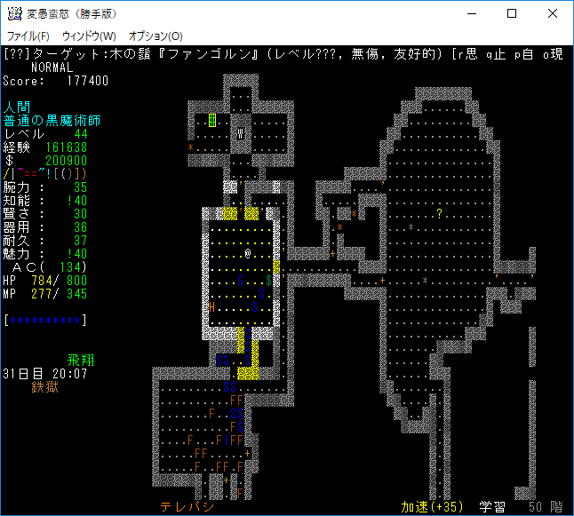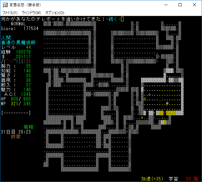 まともな穴を掘りたいからテレポートをしたら追跡されたでござる。八雲だったからまだしも魔力の嵐を使うユニークだったらテレポートした瞬間に死んでいたな。やっぱり変愚蛮怒は難しい。勝手版になっても難しい!