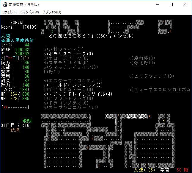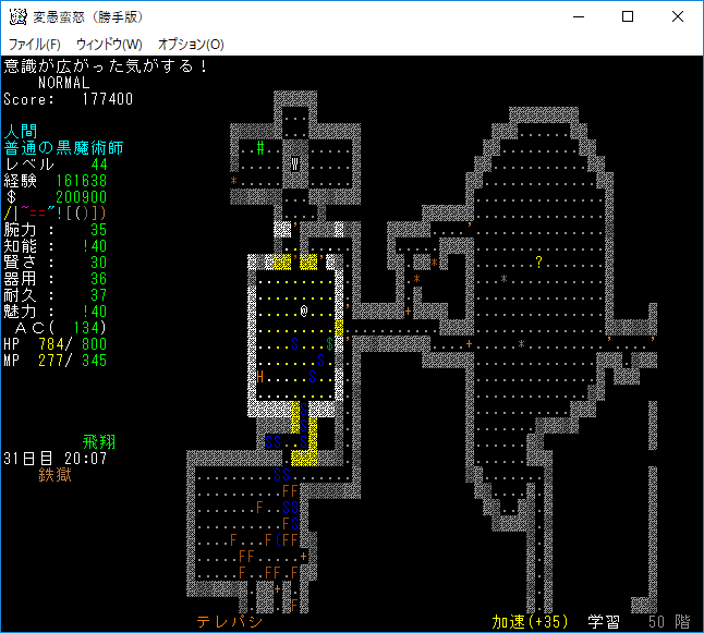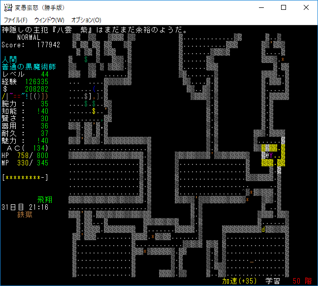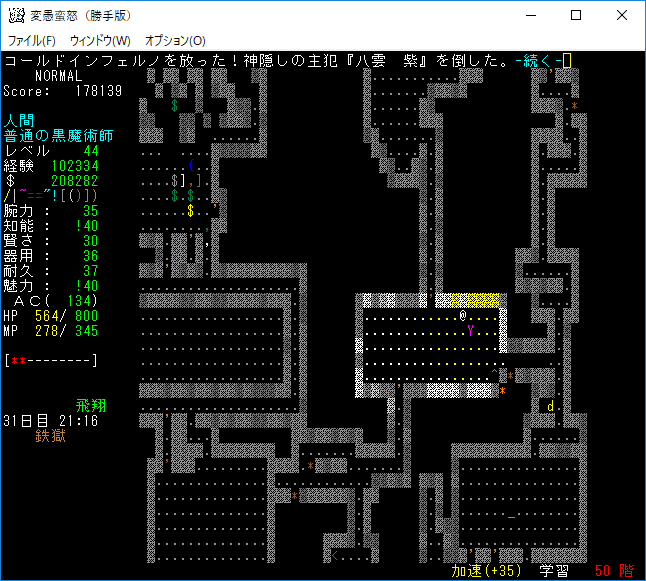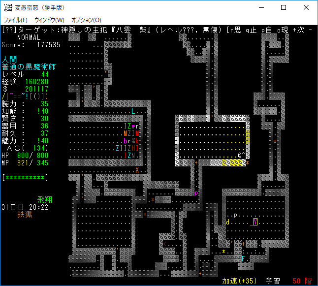 おはようございます。変愚蛮怒東方Project勝手版のプレイ日記を始めます。『八雲 紫』さんと戦うために鉄獄地下50階に来ました。だけど階層の主がいるとメッセージは表示されません。本当にいるのかね?